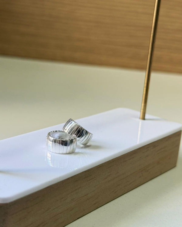 Aros de plata 925 con textura drapeada y cierre click. Movimiento, brillo y estilo inconfundible.