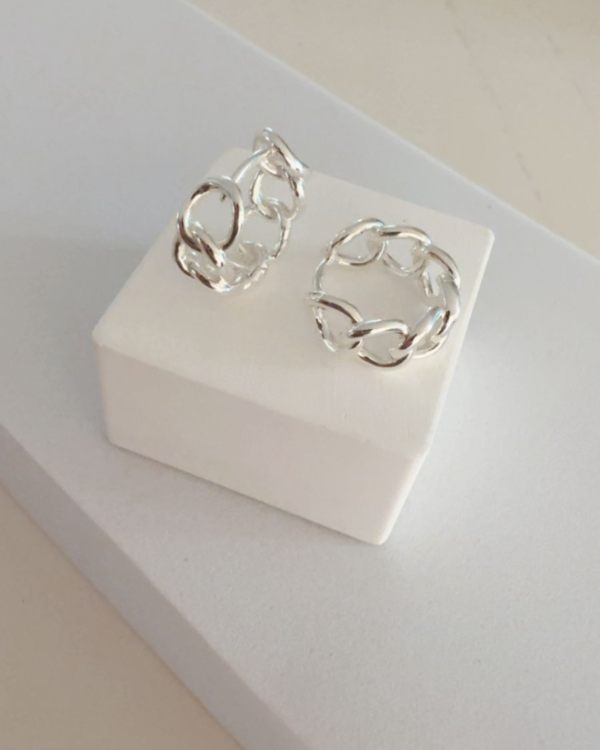 Aros italianos exclusivos con diseño de eslabones pulidos y cierre click para máxima comodidad. Su estructura liviana y moderna los convierte en una pieza versátil. Hechos en plata 925