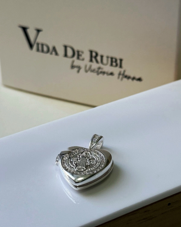 Dije con piedras cubic y la imagen de San Benito, elegante y protector.